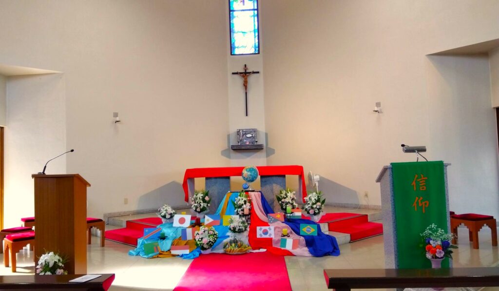 祭壇には世界各国の国旗と花々が飾られ、地球儀を中心に、教会全体が「一つの家族」としての象徴に包まれていました。