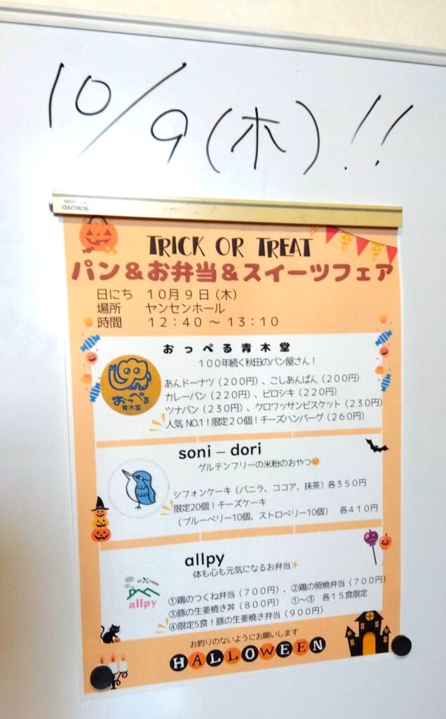 明日の昼休みには、生徒たちが毎回楽しみにしている恒例イベント、パン販売が行われます。今回はハロウィンを前に、パンだけでなくスイーツやお弁当も登場予定!色とりどりのポスターにも、生徒たちの期待が高まります。