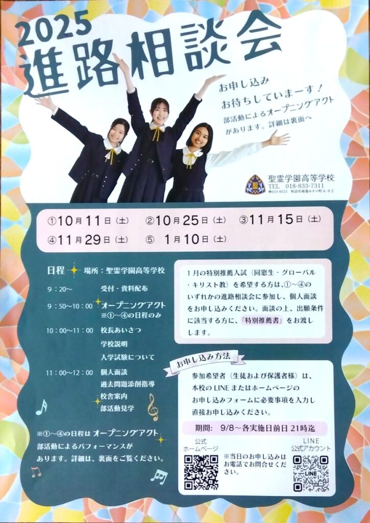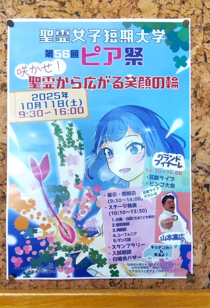 同じく11日(土)、聖霊短大では「ピア祭」が開催されます。今年のテーマは「咲かせ!聖霊から広がる笑顔の輪」。秋田市高清水の緑あふれるキャンパスで、学生たちの企画や模擬店、ステージ発表を楽しめます。ぜひお気軽にお立ち寄りください。