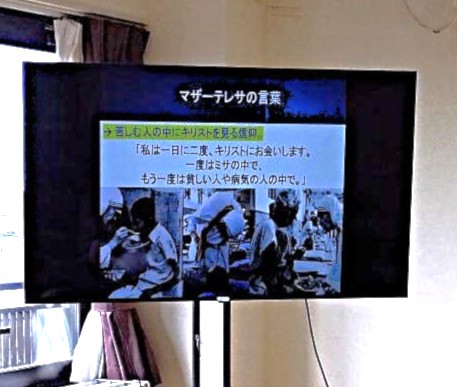 マザー・テレサの言葉「わたしは1日に二度、キリストにお会いします。一度はミサの中で。もう一度は、貧しい人や病気の人の中で。」を手がかりに、苦しむ人の中に神を見る信仰、そして「誰かを助けることは神を愛すること」であるという考えに触れました。