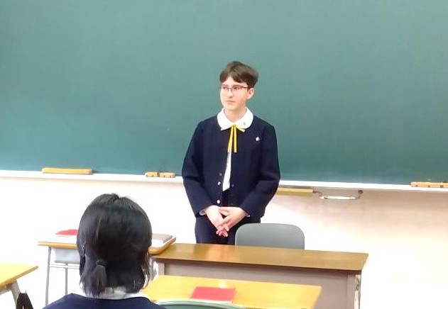 オーストラリアから3か月間の留学で来日した3名の生徒(Luciaさん、Alexさん、Margaretさん)が、3人そろって初登校。少し緊張しながらも、日本語で元気にあいさつをしました。