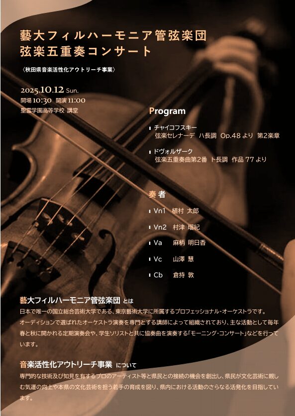 10月12日(日)、本校講堂において「藝大フィルハーモニア管弦楽団 弦楽五重奏コンサート」(秋田県音楽活性化アウトリーチ事業)が開催されました。県内外から多くの皆様にご来場いただき、講堂は音楽の喜びと緊張感に包まれました。