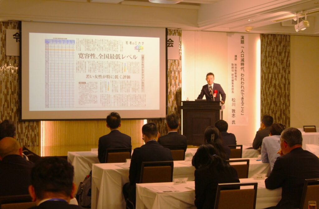 講師には秋田魁新報社 取締役・編集本部長の松川敦志様をお迎えし、「人口減時代、われわれができること」というテーマでご講演をいただきました。