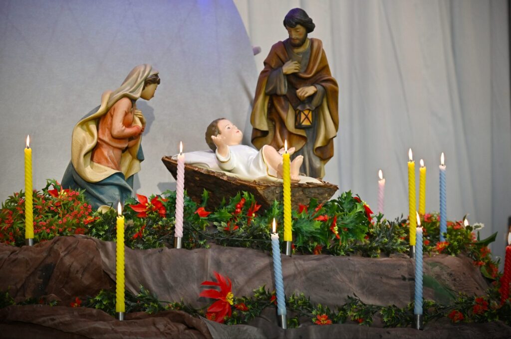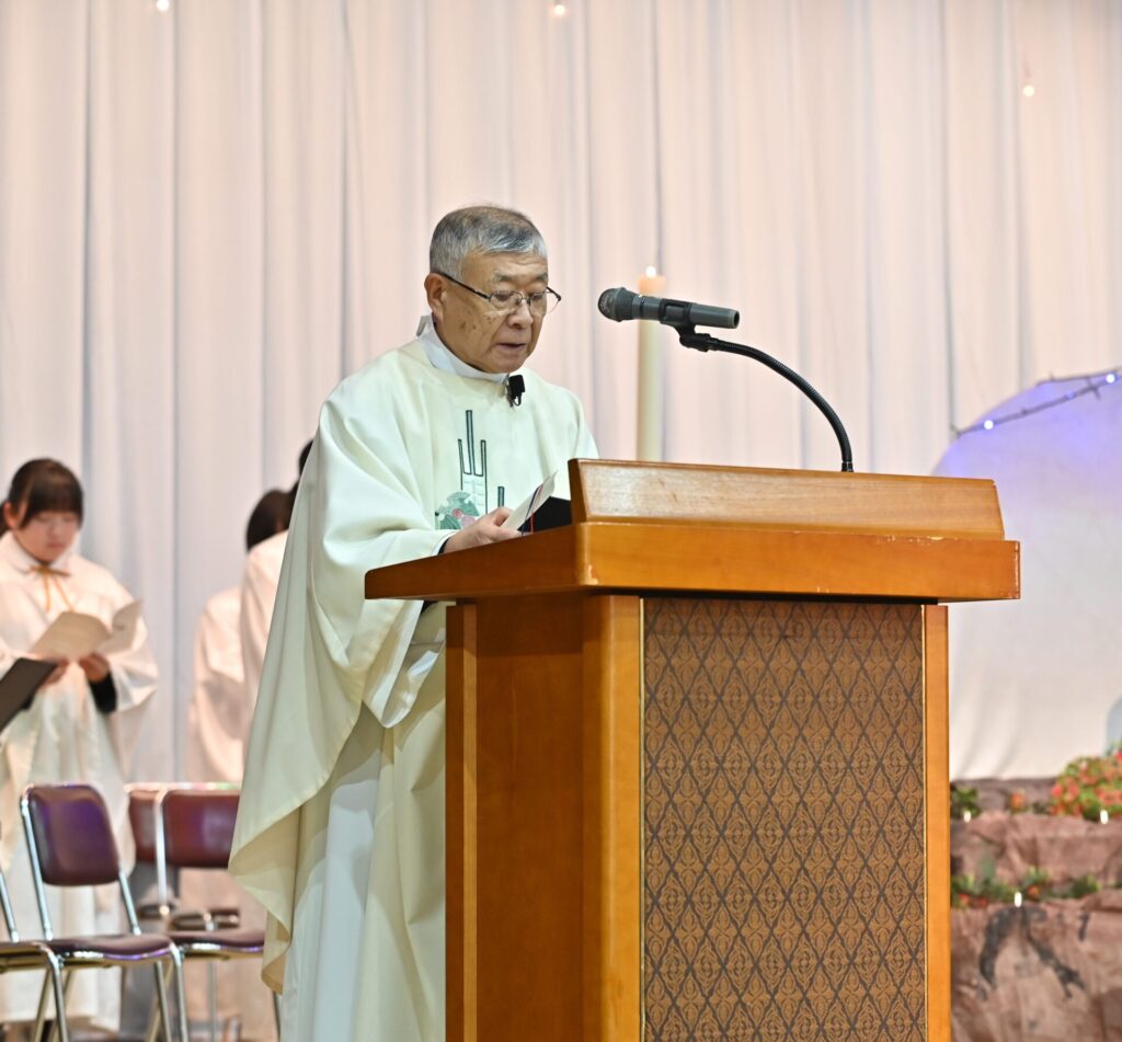 カトリック秋田教会の 飯野耕太郎神父様によるルカによる福音書「羊飼いと天使」の朗読と、クリスマスメッセージに続いて、この世界に平和と希望が満ちるよう願って、全員で「賛美の祈り」を捧げました。