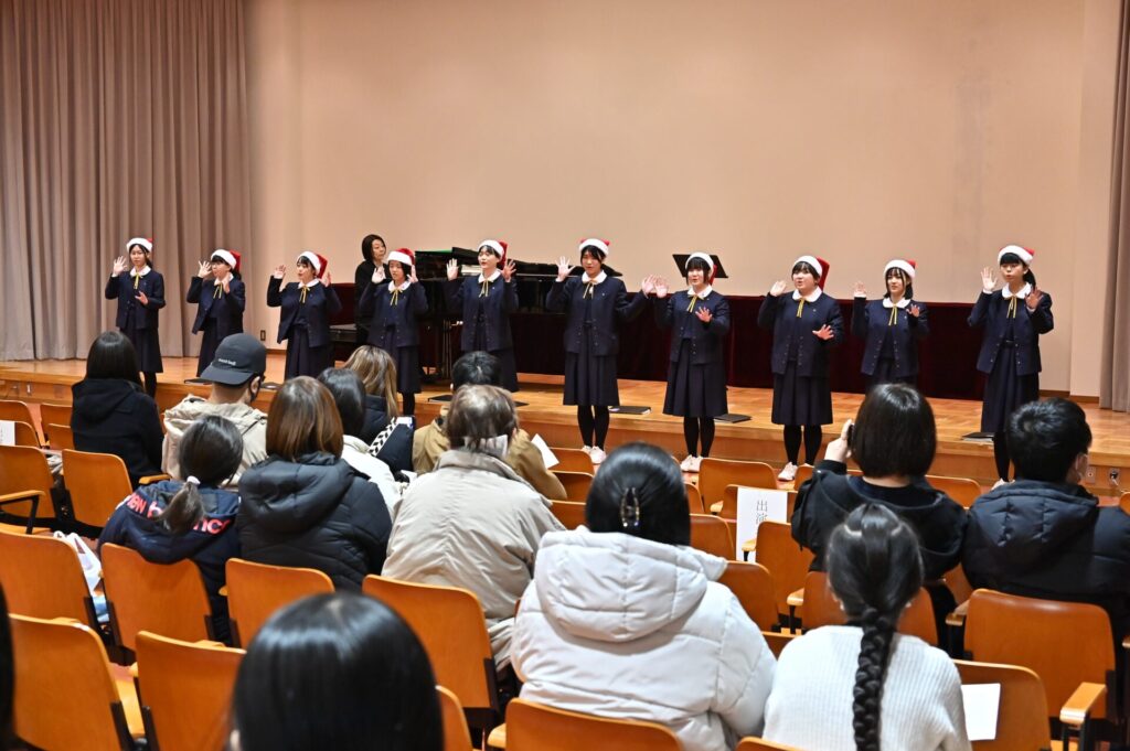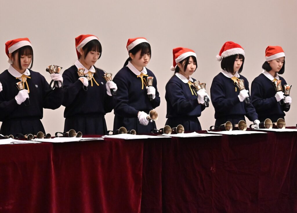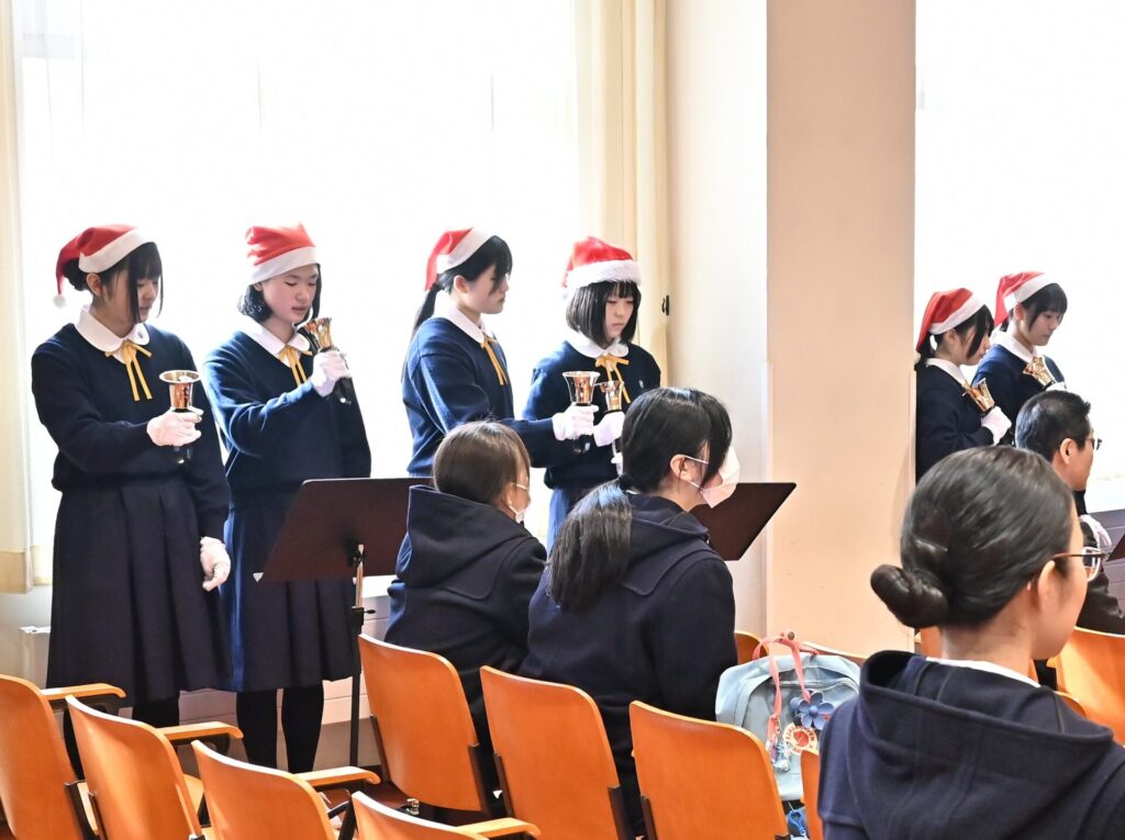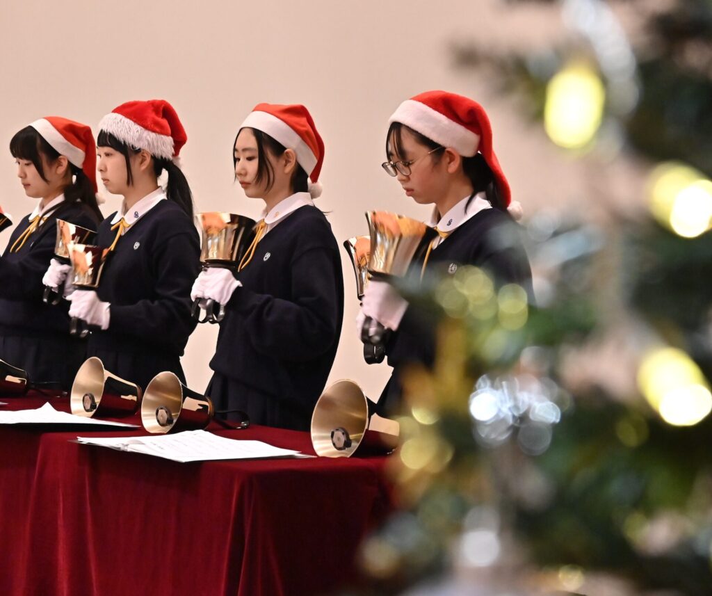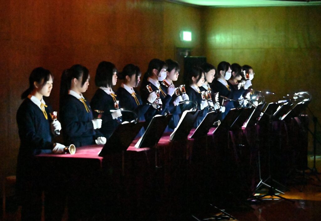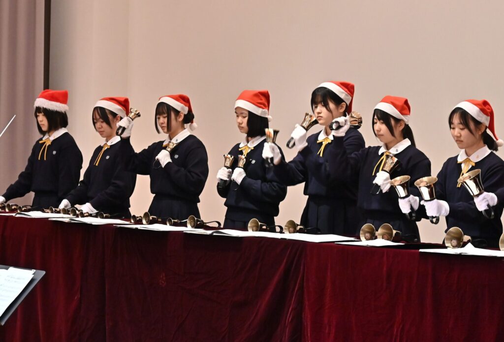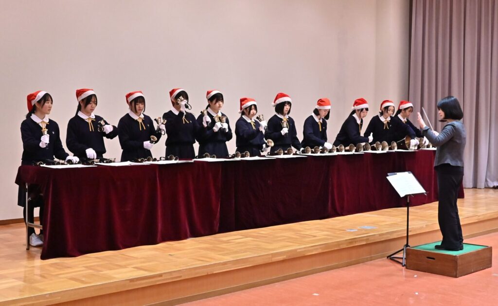 ハンドベル部の演奏では、クリスマスにぴったりの澄んだ音色が講堂に広がり、初めて耳にする方々からも喜びの声が聞かれました。