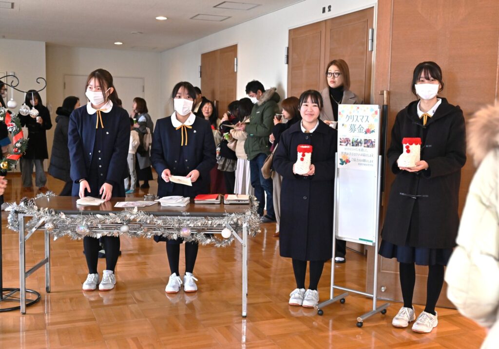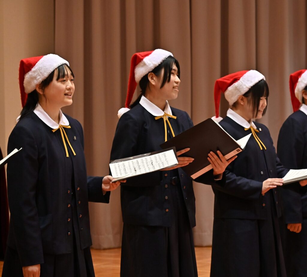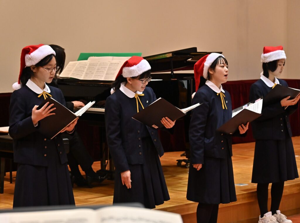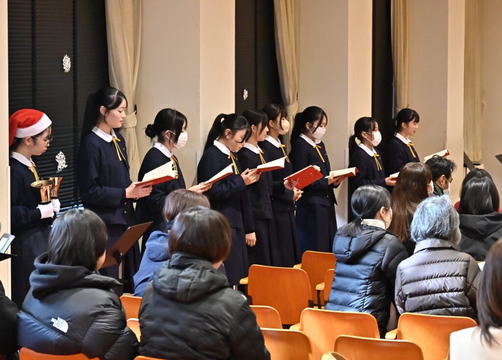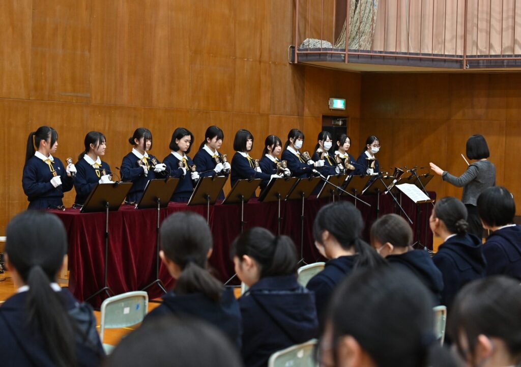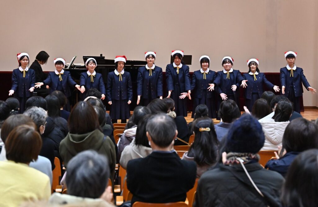 ハンドベル部の演奏では、クリスマスにぴったりの澄んだ音色が講堂に広がり、初めて耳にする方々からも喜びの声が聞かれました。