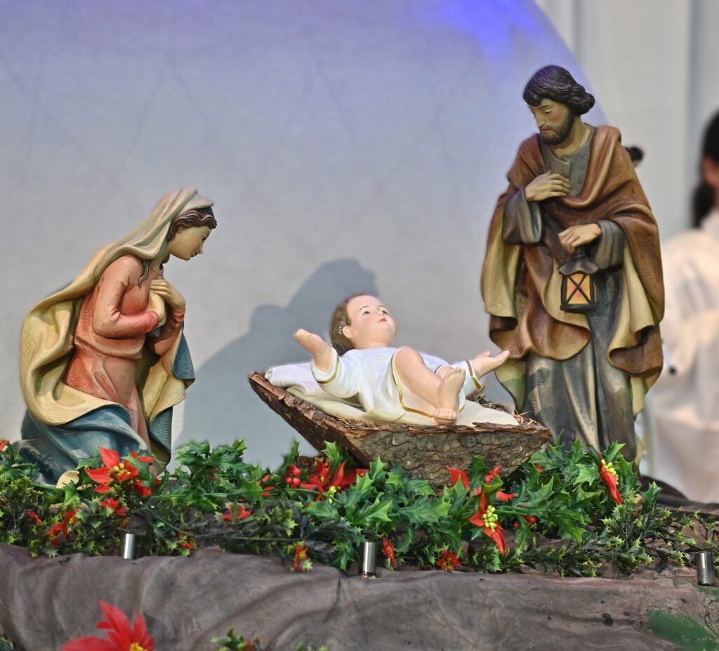 緞帳の陰から、合唱部によるグレゴリオ聖歌「Rorate coeli(天よ露をしたたらせ)」が聞こえてきました。この歌声によって新しい時代の始まりが告げられると、新約聖書の朗読です。ルカによる福音書「イエスの誕生の予告」は3人の朗読劇で。続いて「イエスの誕生」が朗読されると、イエス様を抱いた神父様とマリア様、天使たちが、聖歌「しずけき」の歌声に合わせて入場します。