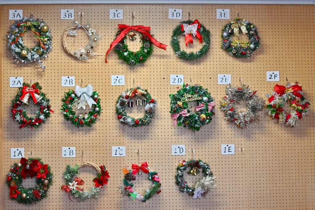 玄関を入ると、全クラスの手作りリースがずらりと並び、訪れた地域の皆さまを温かく迎えていました。