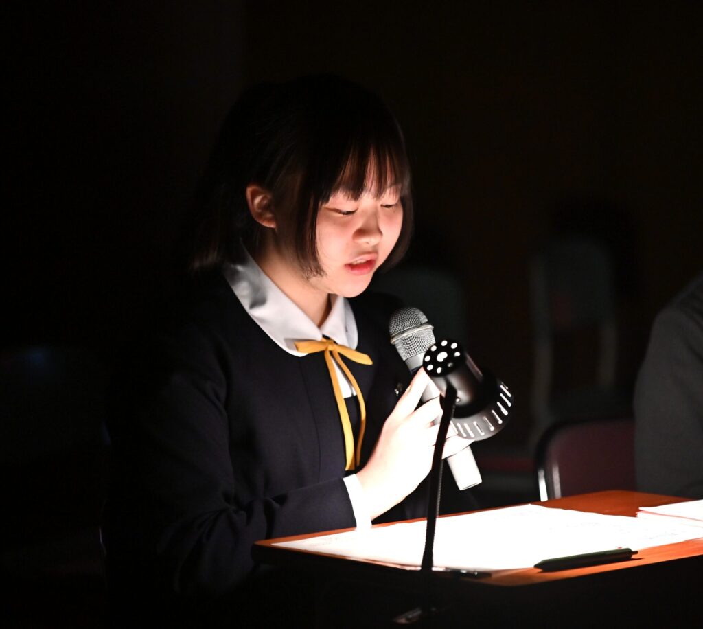 進行や朗読、演奏や照明など役割を担う生徒たちは、落ち着いた表情で自分の役割に向き合います。照明、音、動き――そのすべてが重なり合い、会場全体が祈りの空間へと整えられていきます。