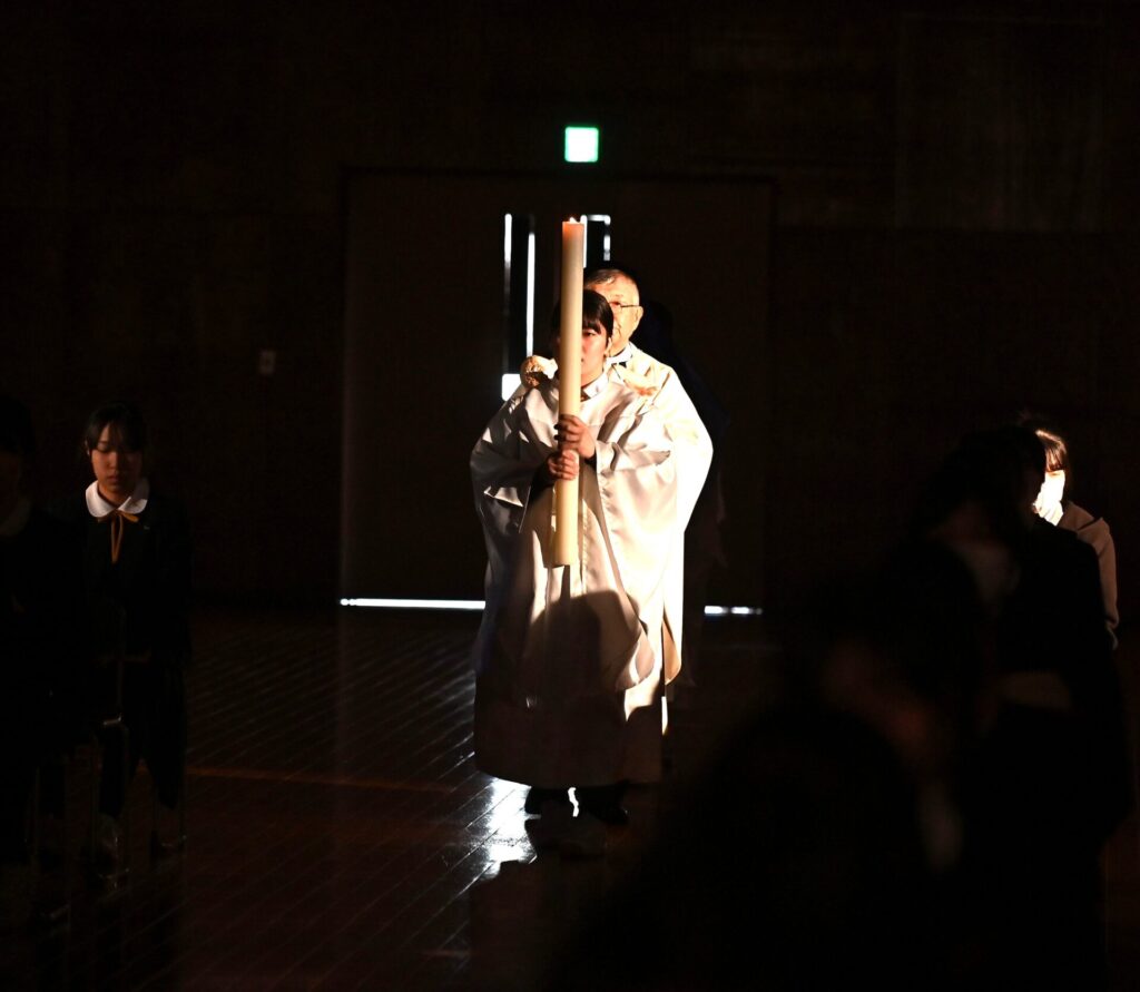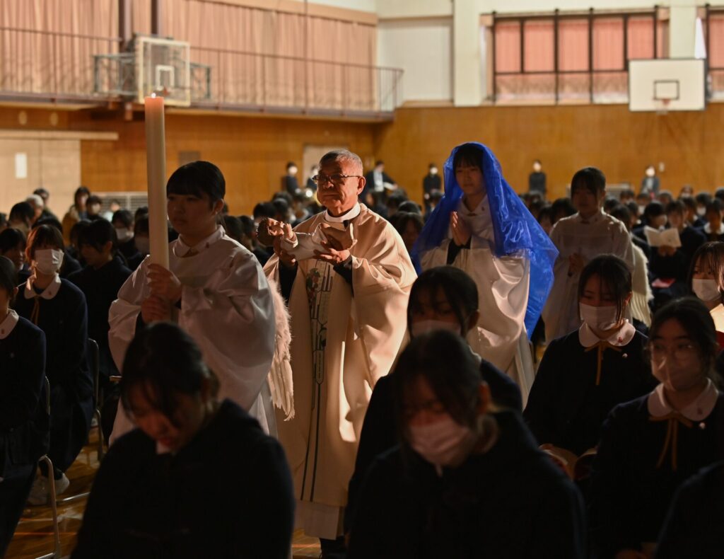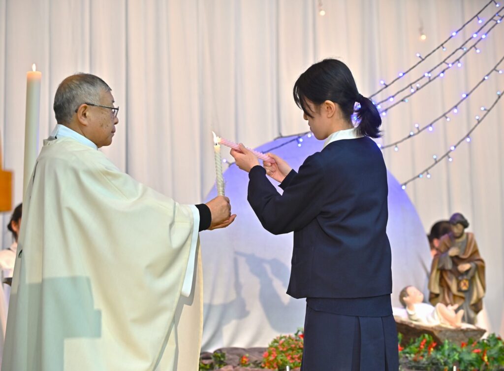 光の奉献では、合唱部の清らかな歌声が流れる中、各クラス代表が神父様からろうそくの光を受け取り、幼子イエス様に捧げました。