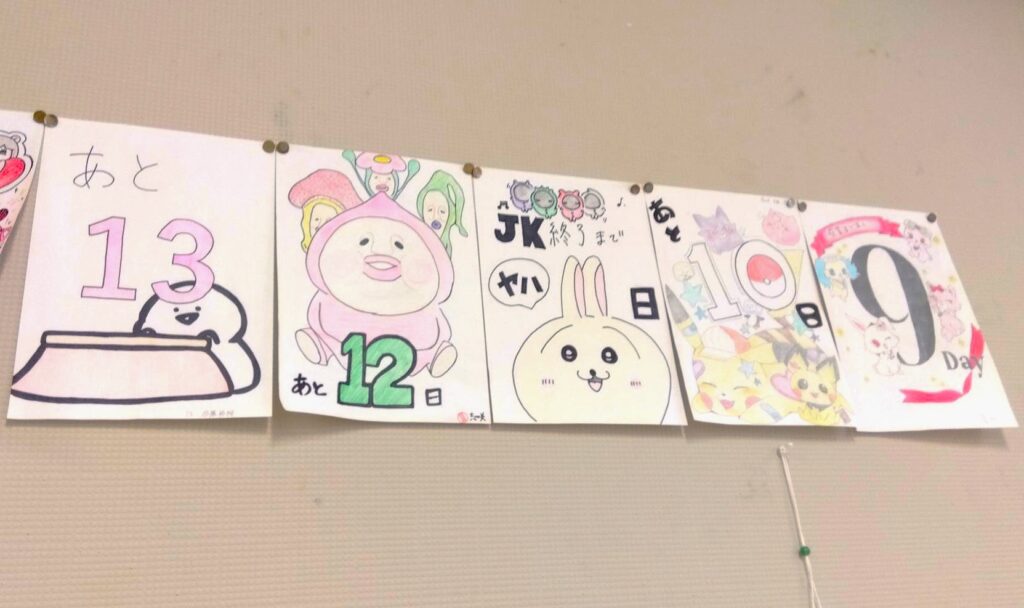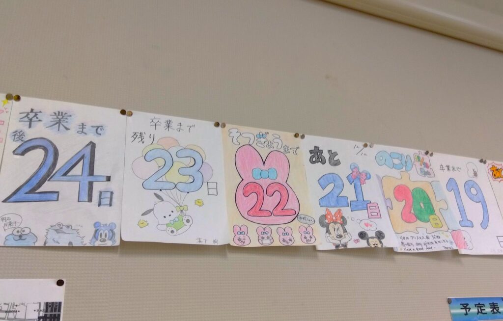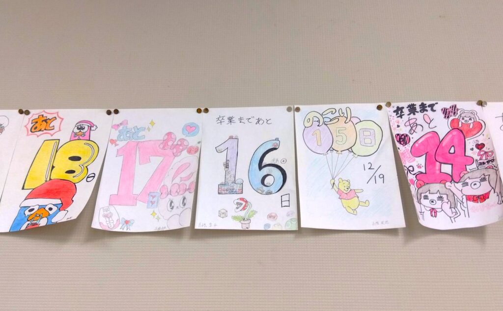 3年生の教室に掲示されている卒業までのカウントダウン。このクラスでは、12月1日から一日一日を大切に数えながら、登校日を迎えてきました。色とりどりの数字やイラストには、仲間と過ごした時間への想いと、未来へ進もうとする前向きな思いが込められています。