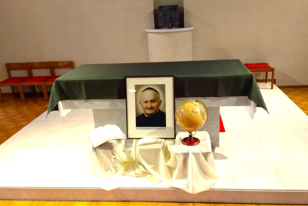 祭壇前には、1月15日に記念日を迎えた本校の創設者・聖アーノルド・ヤンセンの御絵が飾られています。今を生きる私たちを包み込むアーノルド様の優しいまなざしを感じました。