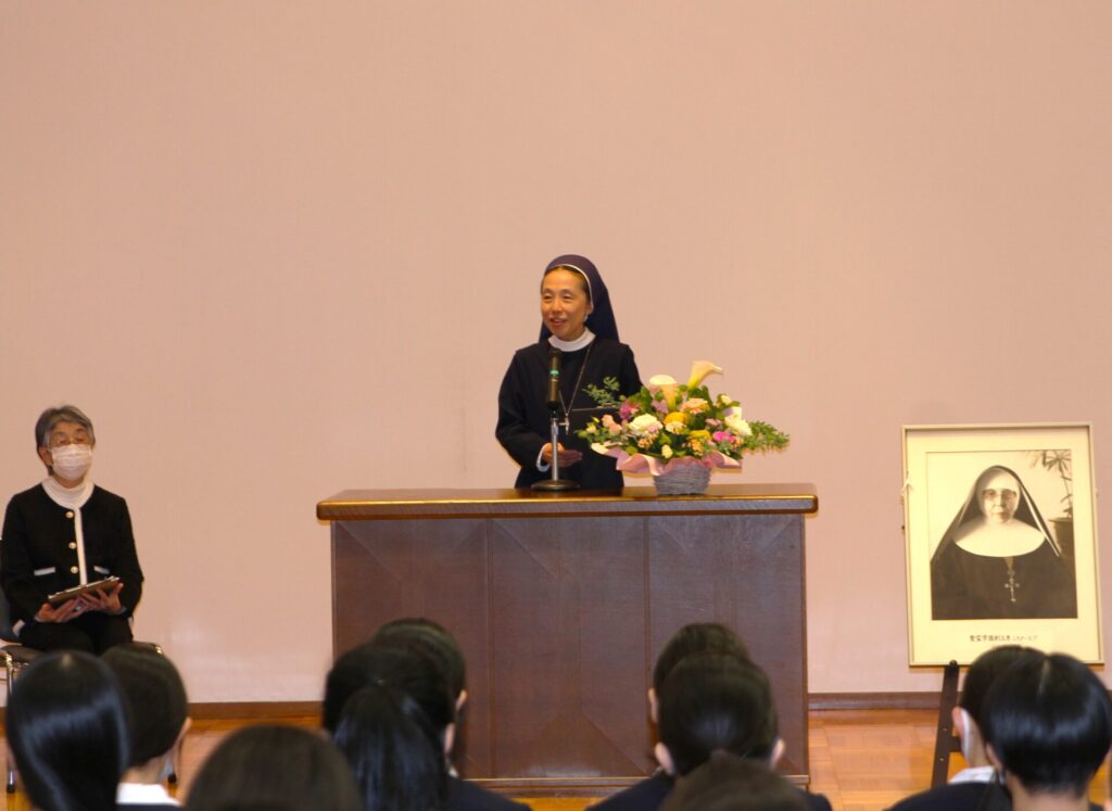 ステージ上には、創立協力者であるシスターピアのお写真が、花とともに飾られ、