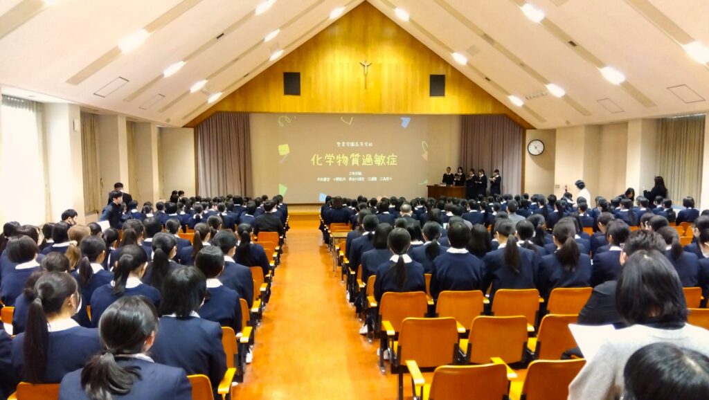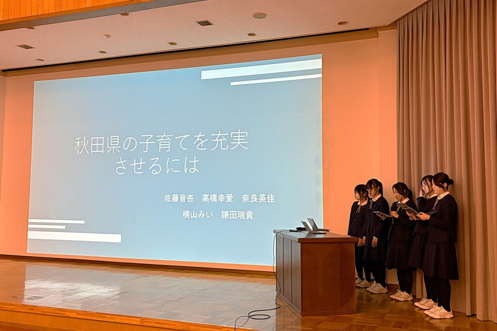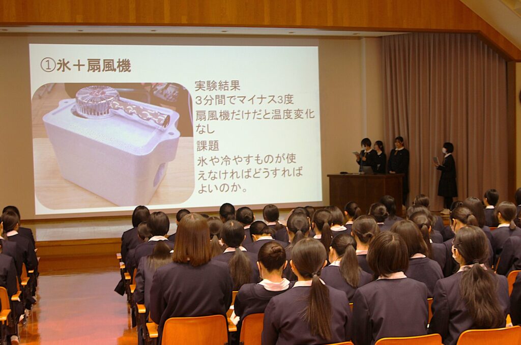 クラス予選を通過した6グループが、ステージに立ちました。会場には2年生全員に加え、1年生も全員参加。先輩の発表に真剣な眼差しを向け、記録用紙に熱心にメモを取る姿から、学びが確かに受け継がれていく気配が感じられました。