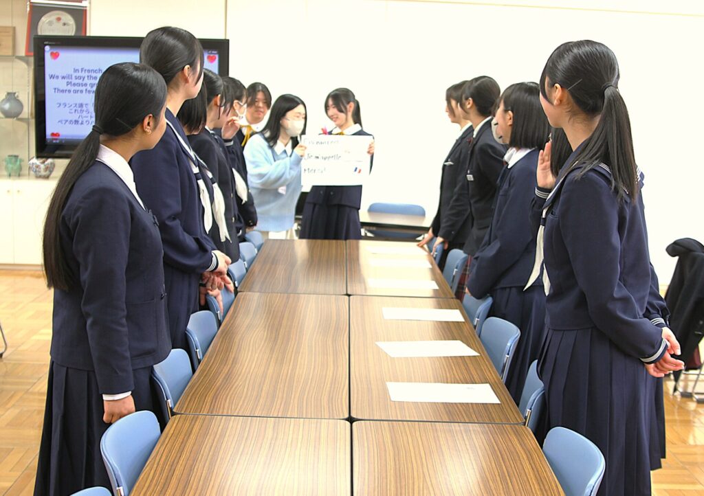 会議室では、フランス語とスペイン語を用いたゲームを実施。本校では、韓国語を含む3つの第二外国語から選択することができます。