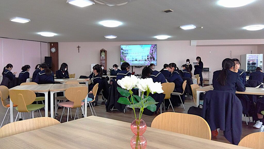 ヤンセンホールに集まったのは、4月から聖霊生となる皆さんと、在校生、そして教職員。新しい出会いに満ちた、あたたかな交わりの時間となりました。