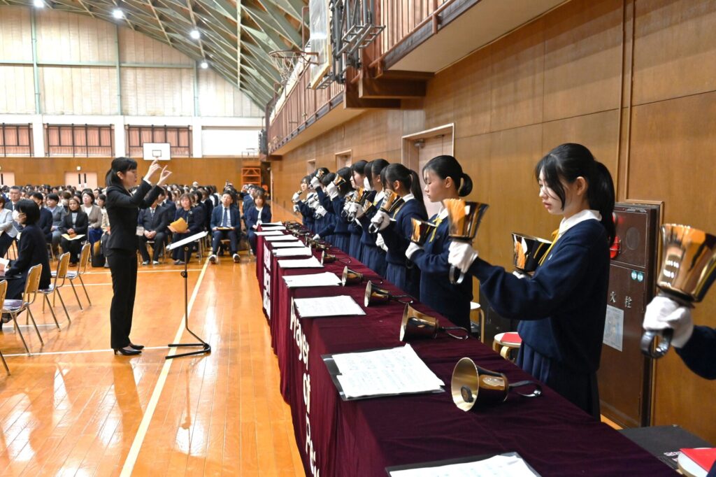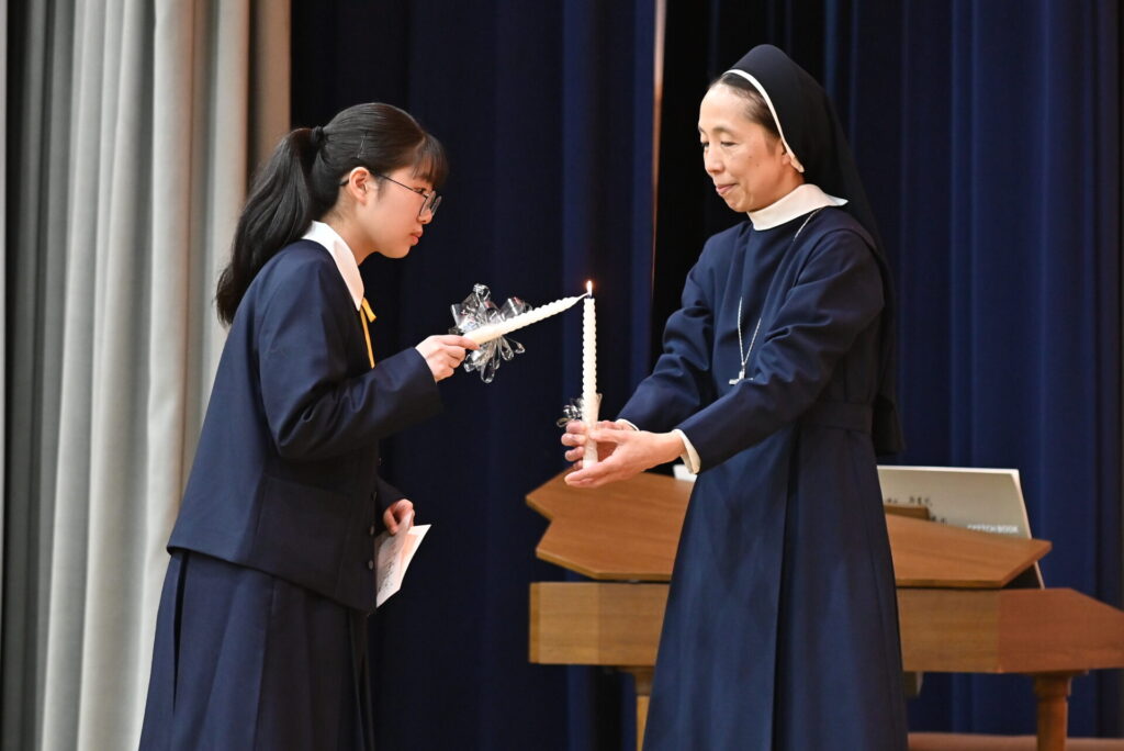 続いて、ハンドベルの優しい音色が鳴り響く中、新入生代表がステージに上がり、「光の奉献」へ。