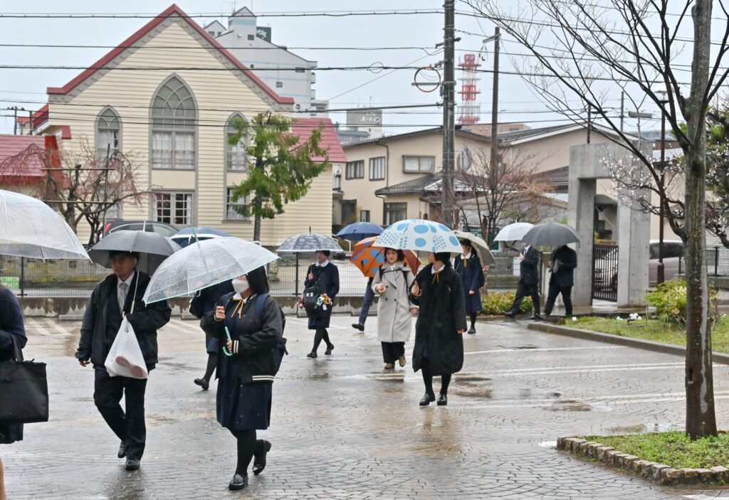 真新しい制服に身を包み、保護者の皆さまとともに、期待に胸を膨らませて本校の門をくぐってきた新入生たち。やわらかな雨は、まるで一人ひとりの歩みを祝福するかのようでした。