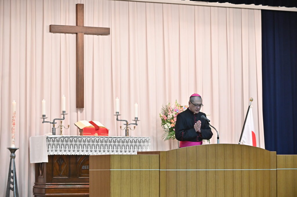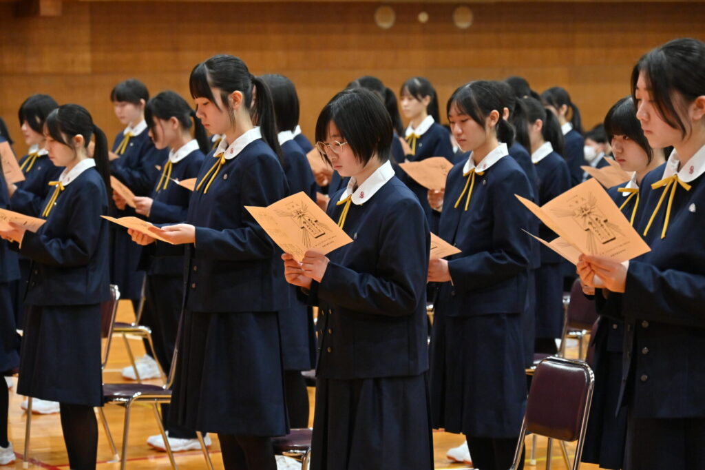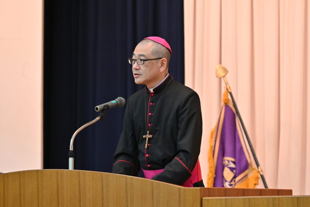 在校生・教職員による校歌斉唱に続いて、成井大介司教様による聖書朗読。