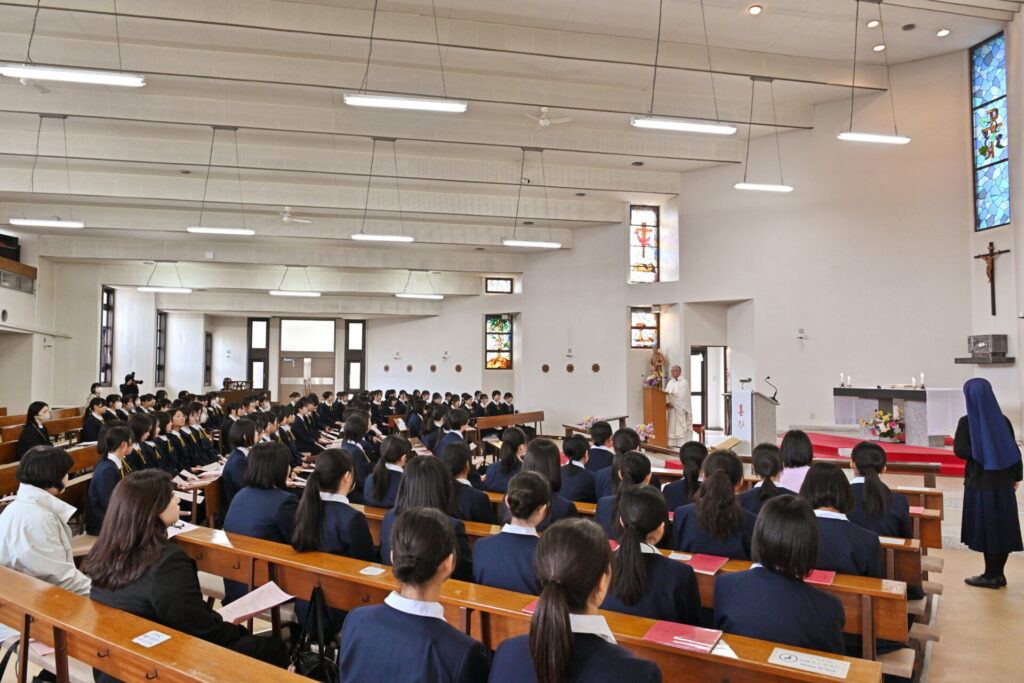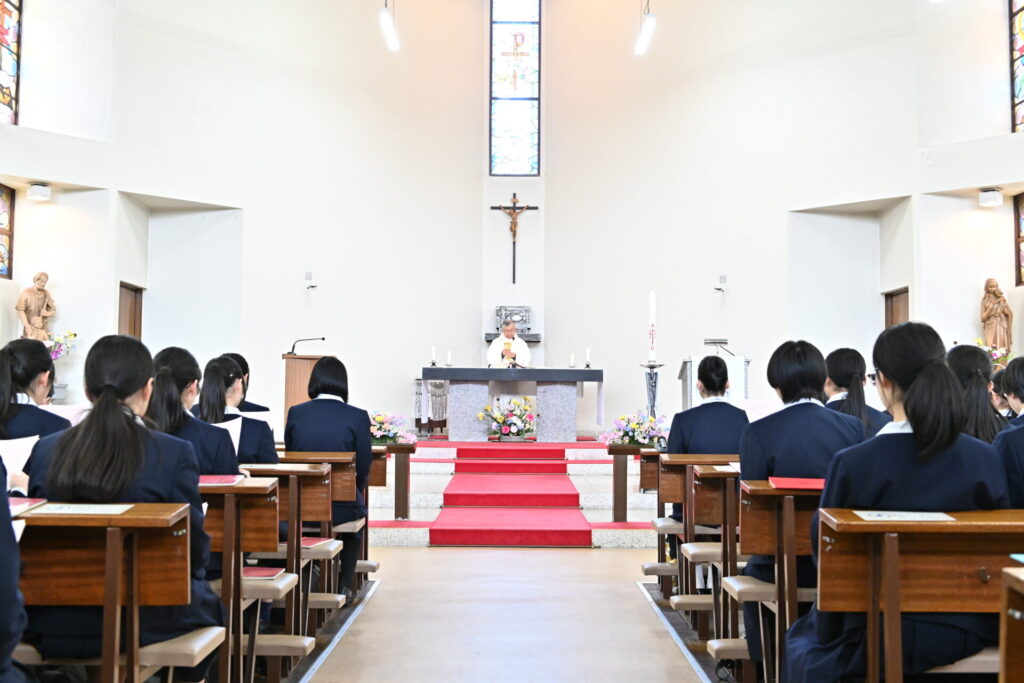 カトリック秋田教会にて入学感謝ミサが行われ、飯野神父様よりミサの意味やお祈りについてのお話をいただきました。新たに始まる高校生活が実り豊かなものとなるよう、新入生全員で心を込めてお祈りしました。