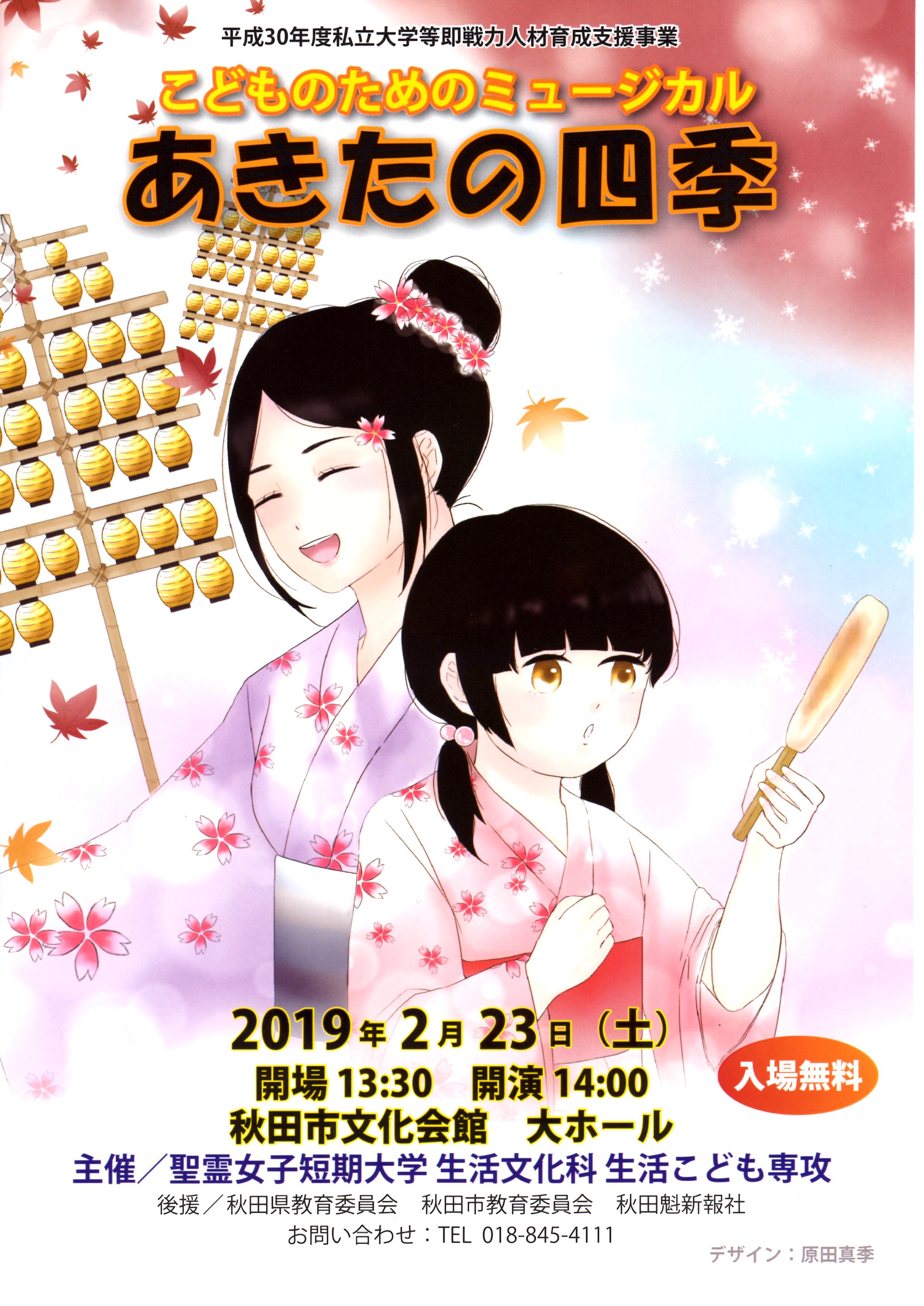 毎回ご好評をいただいているミュージカルを今年も公演することになりました。タイトルは「あきたの四季」。角館のおばあちゃんのおうちに遊びに来た子どもたちが、秋田の自然やおいしい食べ物・お祭に触れその良さを発見するというお話です。当日は【竿灯】の妙技が披露されます。また世界遺産に登録されたばかりの【なまはげ】も登場します。楽しい歌もたくさんで、楽しめること間違いなしです。学生たちも本番に向け練習に励んでおりますので、皆様お誘い合わせのうえ、是非ご覧ください。