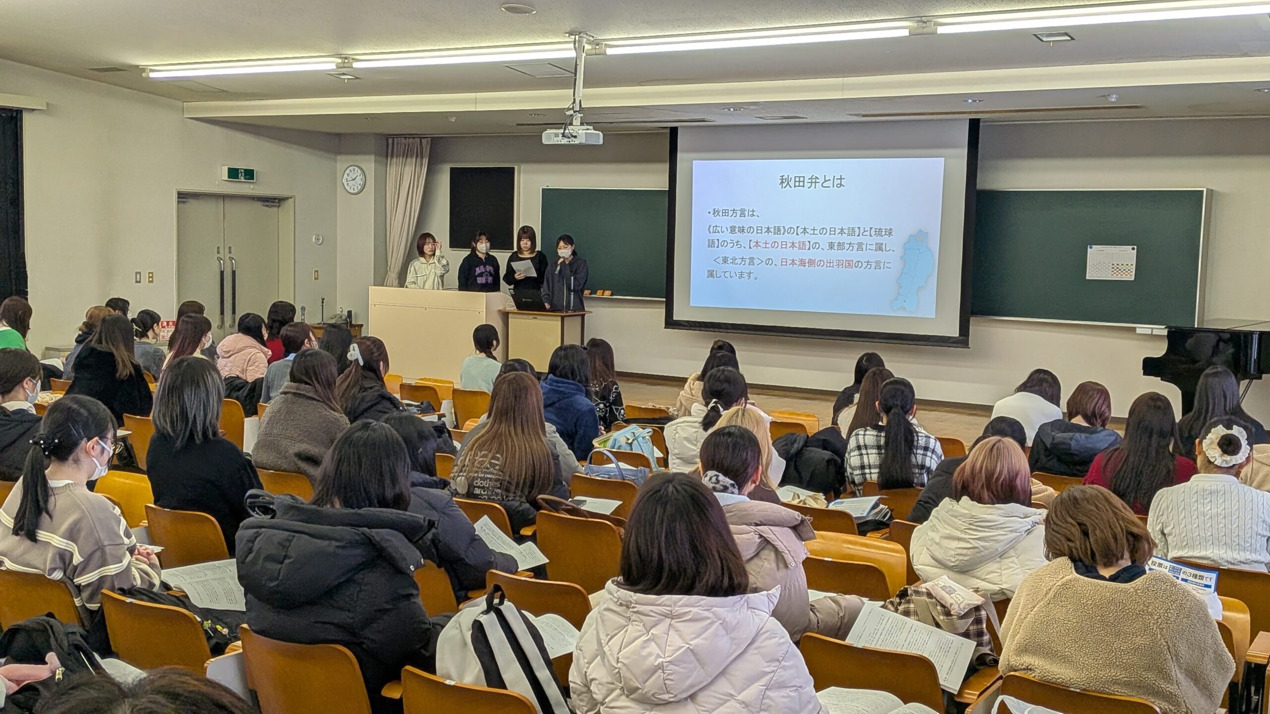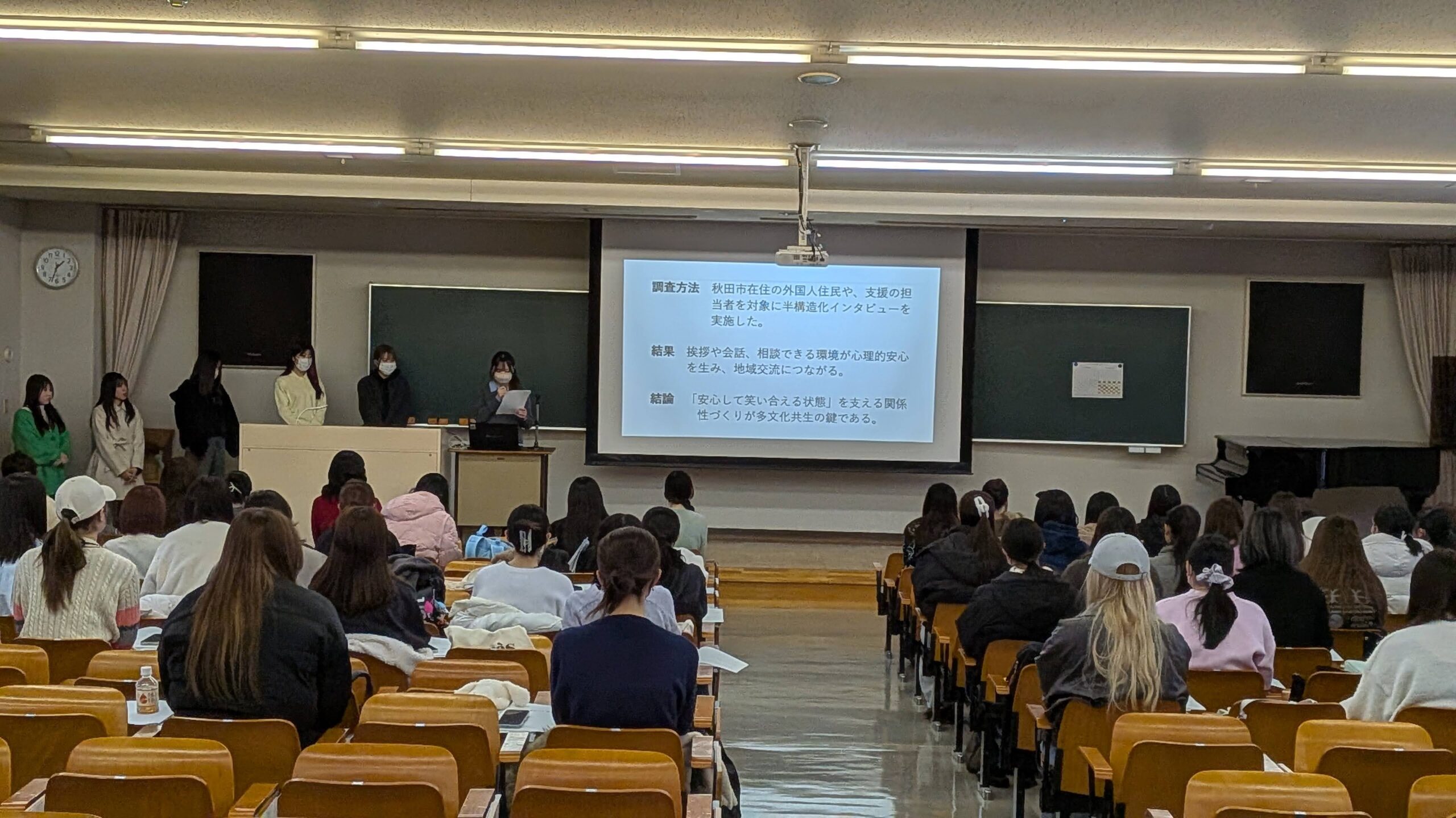 生活文化専攻2年生による卒業研究発表会を、1月29日(木)に本学ヤンセンホールで開催しました。 生活文化専攻の卒業研究は、食文化・SDG’s・多文化共生社会・秋田方言・外国人旅行客に向けた秋田の魅力発信・比較文学・アプリケーションの作成・動画作成など、その研究領域は多岐に渡ります。学生はそれぞれの興味・関心に従って研究テーマを選び、担当教員のもとで一年間学んだ成果を発表しました。 学生は、お互いの研究成果を知ることで、さらに様々な分野への関心を広げる良い機会になりました。