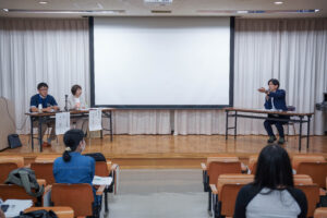 その後、園長シンポジウムとして、轟保育園の園長様とさんない保育園の園長様にご登壇いただき、「園長になるまでのキャリア」「保育をする上での秋田の良さ」など、保育者を目指す学生から寄せられた質問に対して、お話しいただきました。
