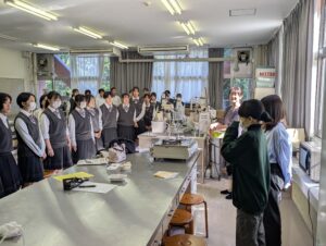 生活文化科健康栄養専攻2年生の授業科目、栄養指導の方法について学ぶ「栄養指導実習」を見学し、専攻科健康栄養専攻では、現在取り組んでいる食品開発の研究について紹介が行われました。