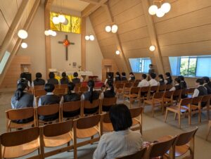 授業の合間には、集団給食実習室や図書館、聖堂などの学内施設を見学。